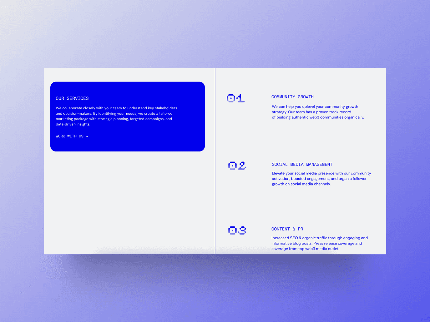 A Web3 marketing agency for industry leading crypto projects. I designed a bold, futuristic brand identity and website from the ground up, channeling the high-energy and spirit of Web3. The design system fused clean minimalism with high-tech visual cues, combining colors, a simple logo, and UI elements that felt both premium and cutting-edge.